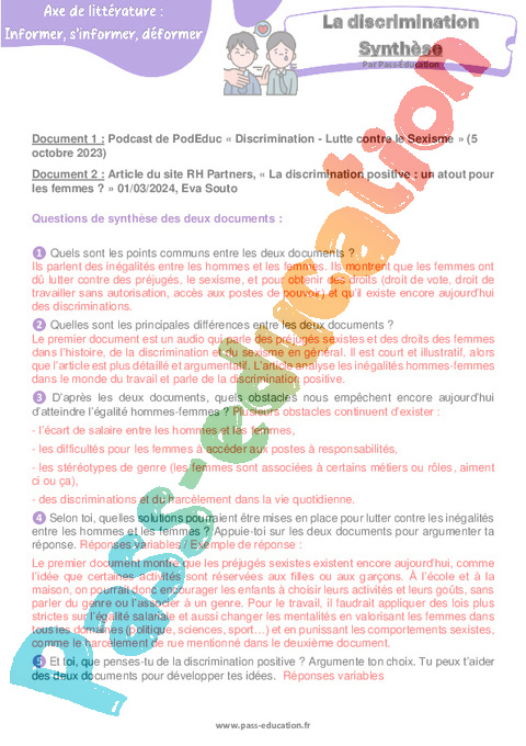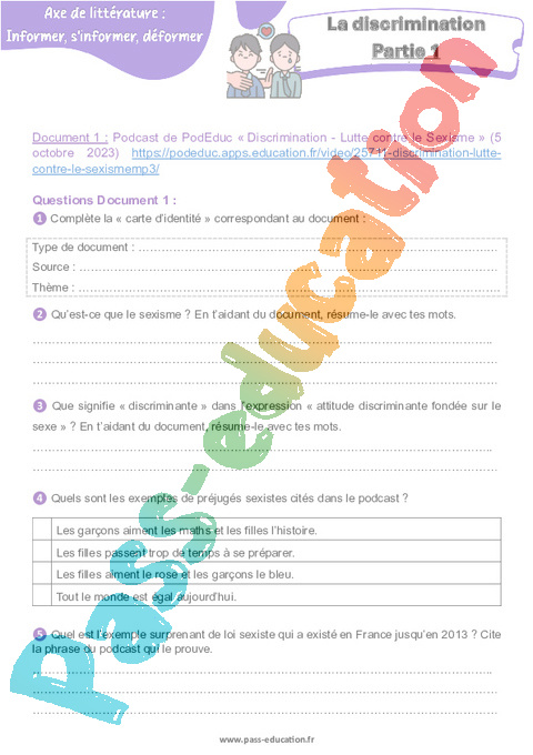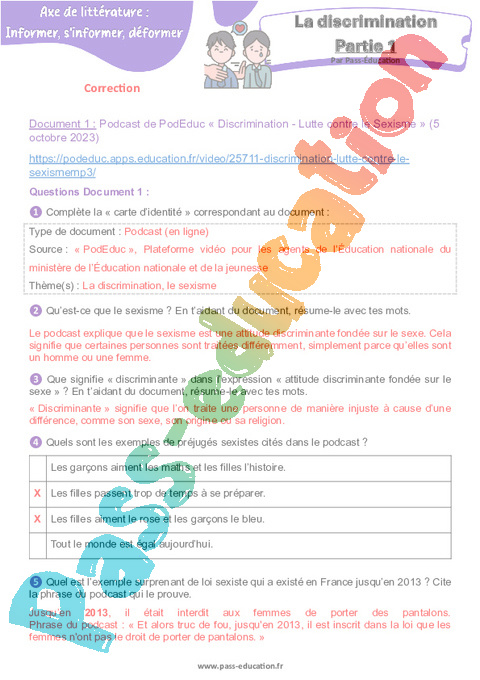 Document 1 : Podcast de PodEduc « Discrimination – Lutte contre le Sexisme » (5 octobre 2023) https://podeduc.apps.education.fr/video/25711-discrimination-lutte-contre-le-sexismemp3/