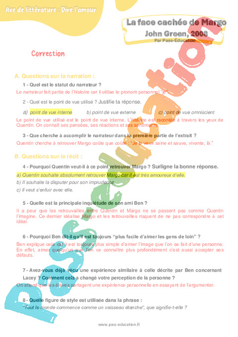 Correction Questionnaire – 4ème La face cachée de Margo (John Green) pdf