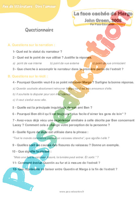Questionnaire – 4ème La face cachée de Margo (John Green) pdf