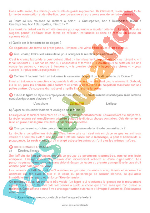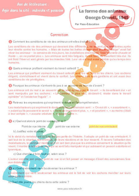 Correction Questionnaire La ferme des animaux (George Orwell) – 3ème pdf