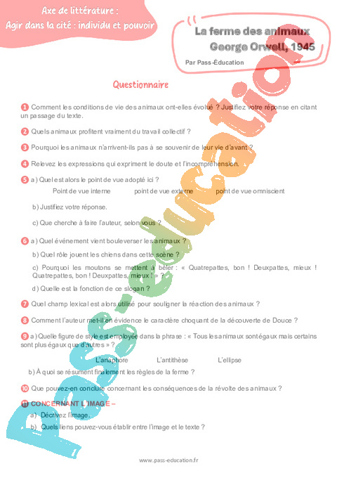Questionnaire La ferme des animaux (George Orwell) – 3ème pdf