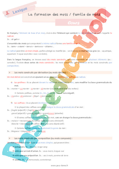 Cours de vocabulaire sur la formation des mots / famille de mots en 6ème.
