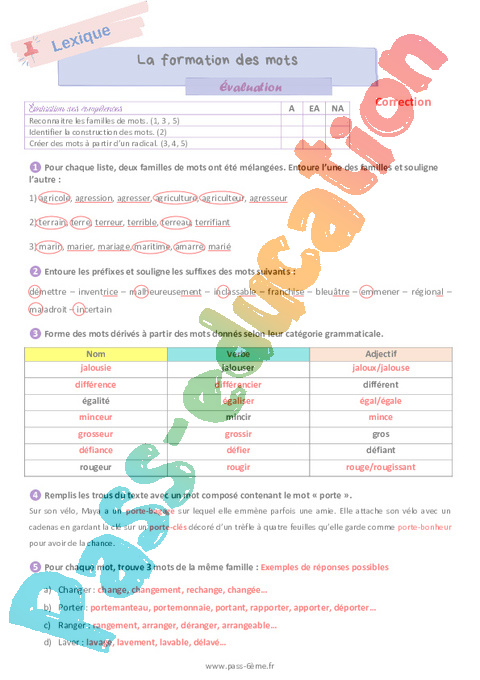 Correction Evaluation 6ème La formation des mots famille de mots pdf