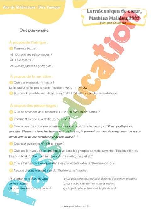 Questionnaire – 4ème La mécanique du cœur (Mathias Malzieu) pdf