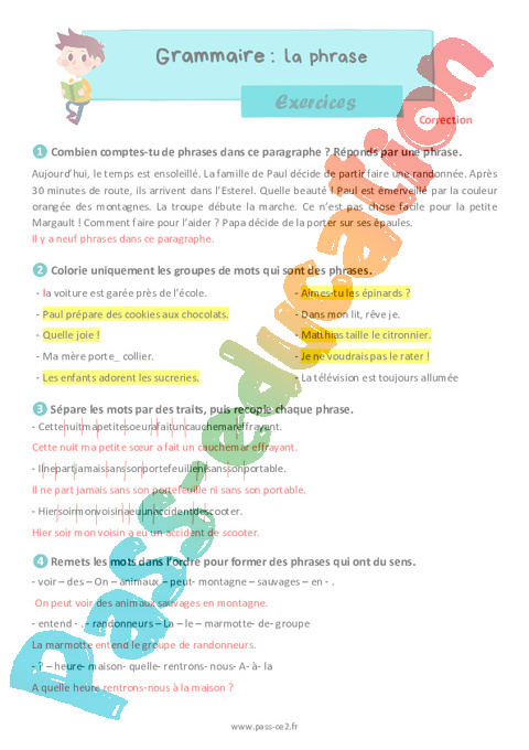 Correction Exercices La phrase – CE2 pdf