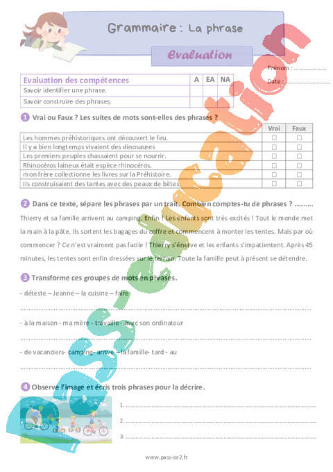 La phrase – Évaluation grammaire pour le ce2 pdf