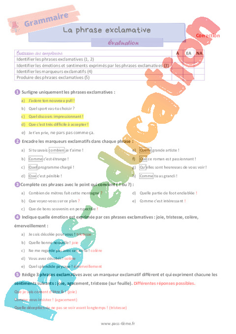 Évaluation de grammaire avec la correction sur la phrase exclamative en 6ème.