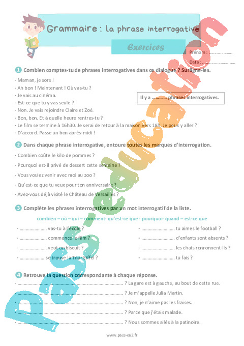 Exercices de grammaire pour le ce2 sur la phrase interrogative.