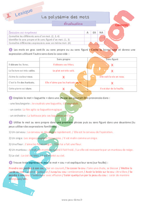 Correction La polysémie des mots – Evaluation de vocabulaire pour la 6ème pdf