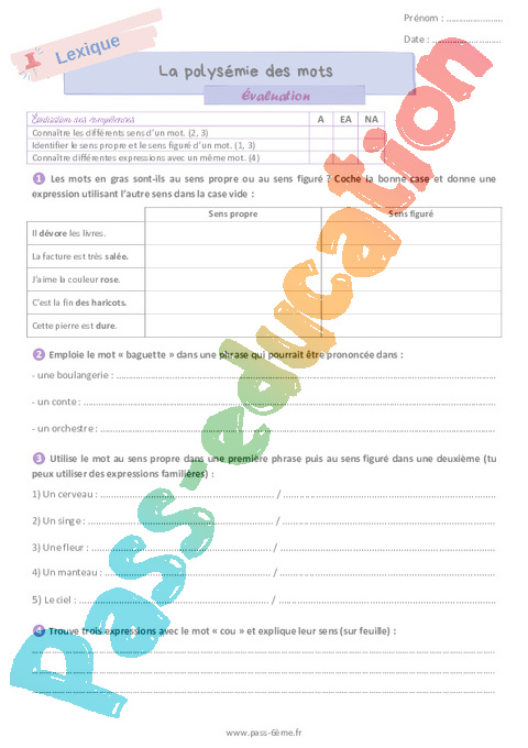 La polysémie des mots – Evaluation de vocabulaire pour la 6ème pdf