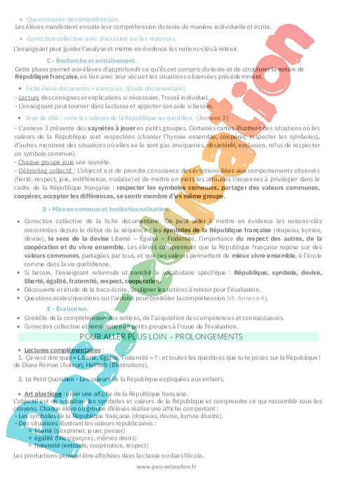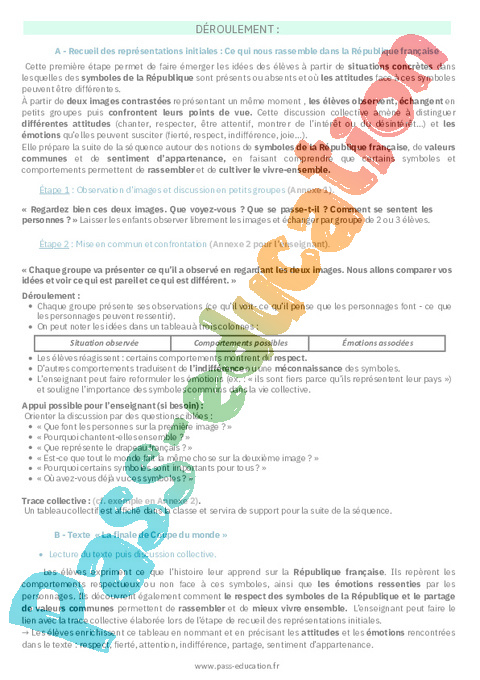 Elle prépare la suite de la séquence autour des notions de symboles de la République française, de valeurs communes et de sentiment d’appartenance, en faisant comprendre que certains symboles et comportements permettent de rassembler et de cultiver le vivre-ensemble.