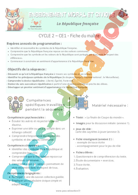 Fiche de préparation – La République française – Ce1 – EMC Education morale et civique.