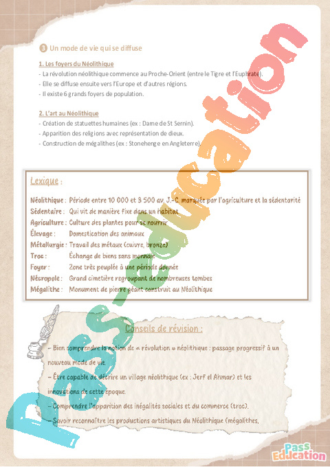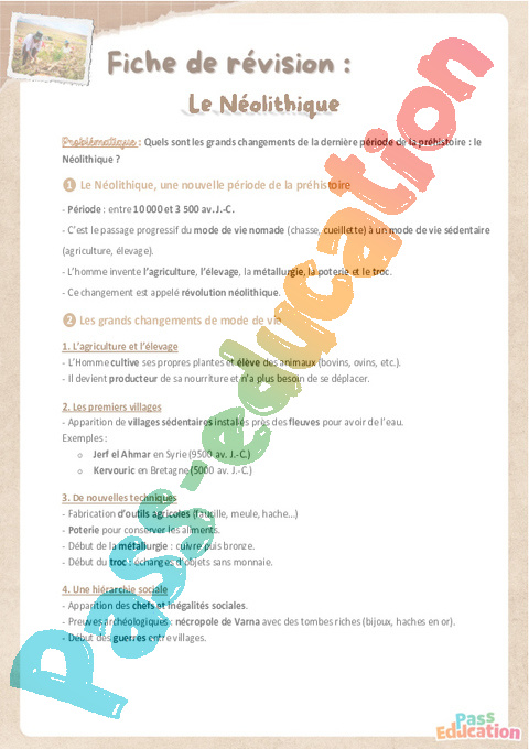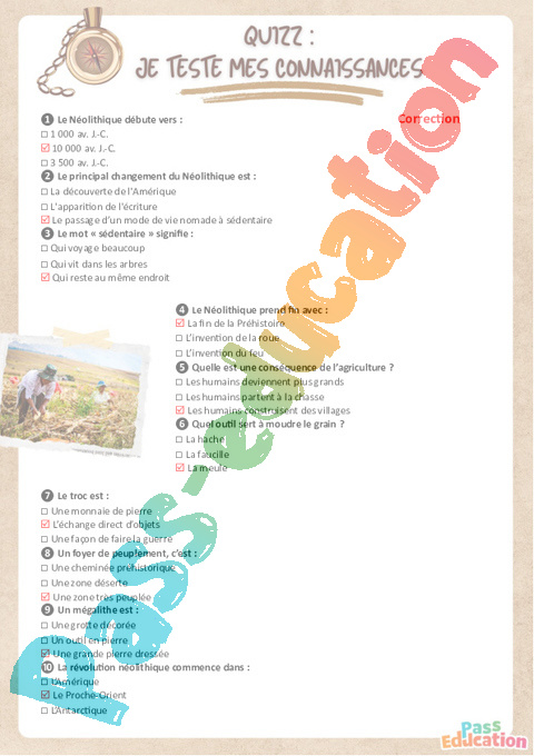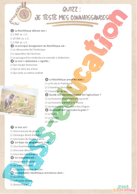 Fiche de révision / QCM en Histoire pour la 6ème : La révolution néolithique.