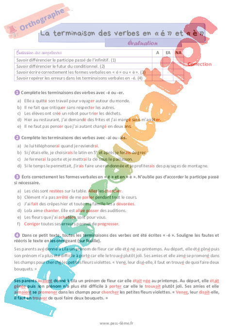 Correction Evaluation 6ème La terminaison des verbes en [é] et [è] pdf