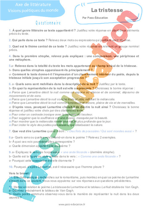Questionnaire La tristesse (Alphonse de Lamartine) – 3ème pdf