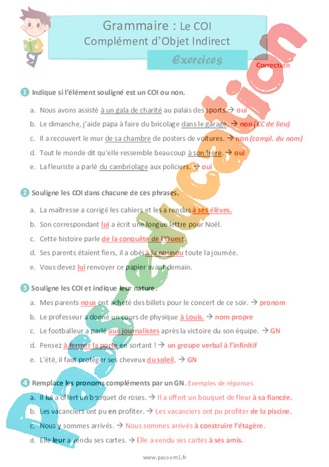 Correction Le COI complément d’objet indirect – Exercices de grammaire pour le cm1 pdf