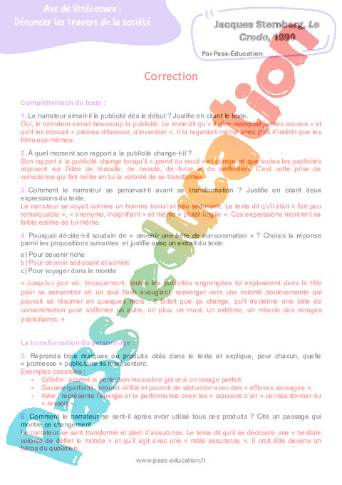 Correction Questionnaire Le Credo (Jacques Sternberg) – 3ème pdf