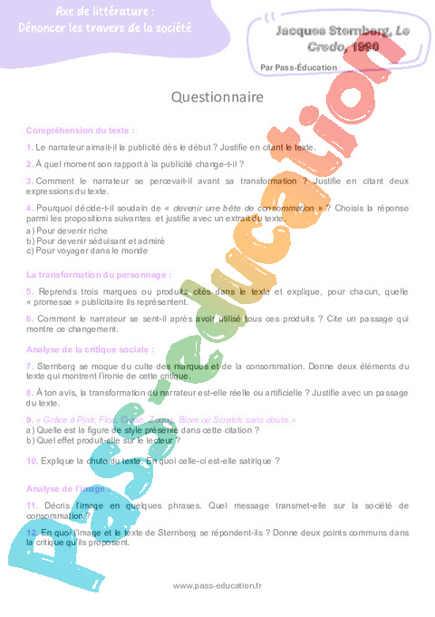 Questionnaire Le Credo (Jacques Sternberg) – 3ème pdf
