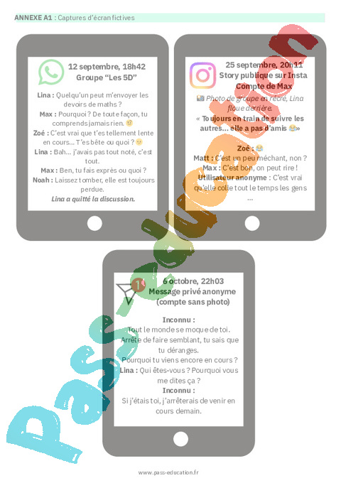 a. Projection de plusieurs captures fictives de messages en ligne qui relèvent du cyber-harcèlement (Annexe A1). Laisser les élèves s’exprimer librement à l’oral à partir de la question :
