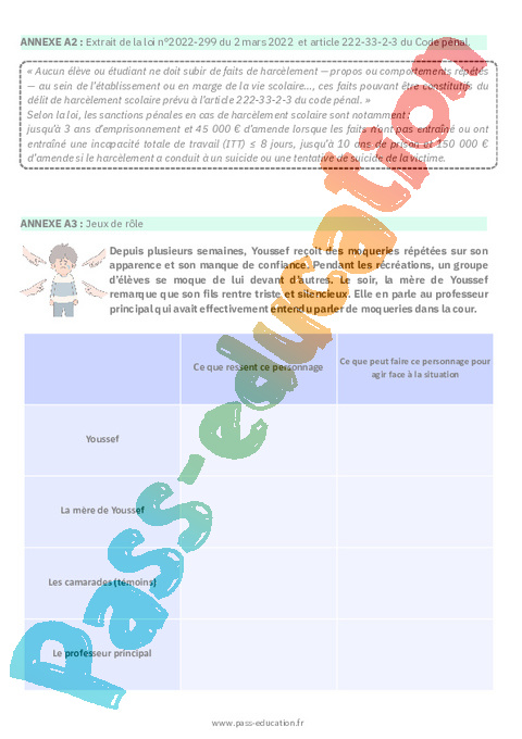 Document support : extrait de la loi de 2022, reconnaissant le harcèlement scolaire comme délit (Annexe A2).