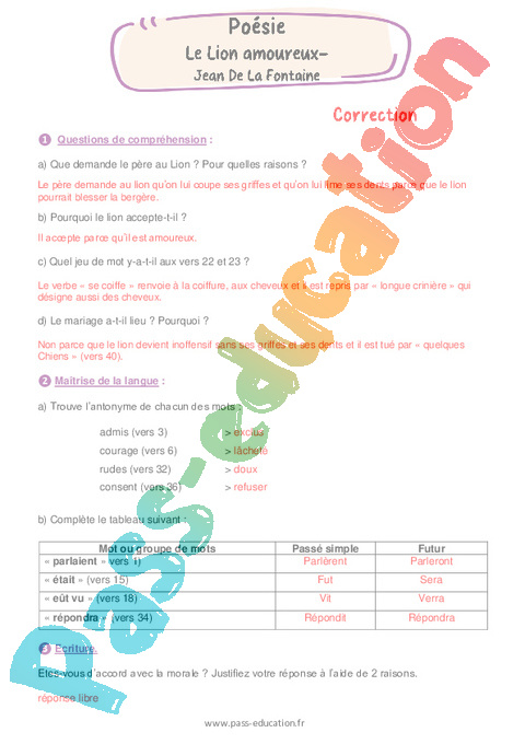 Correction Lecture poésie + Questionnaire Le Lion amoureux – 6ème pdf