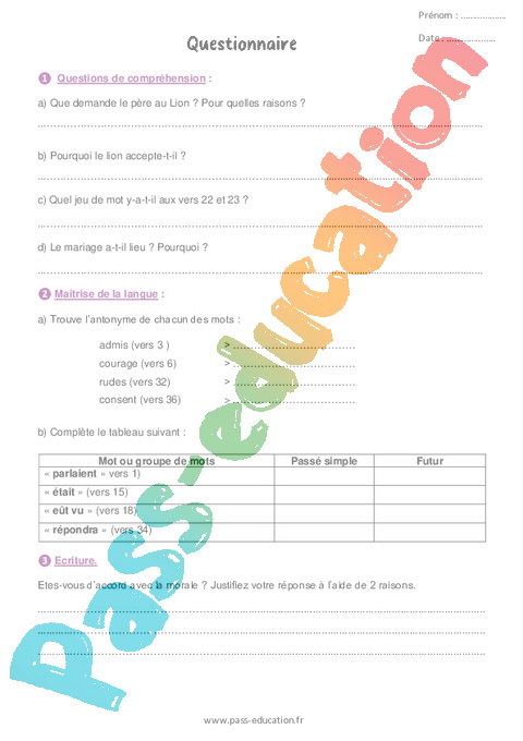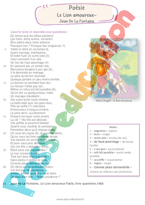 Lecture poésie + Questionnaire Le Lion amoureux – 6ème pdf