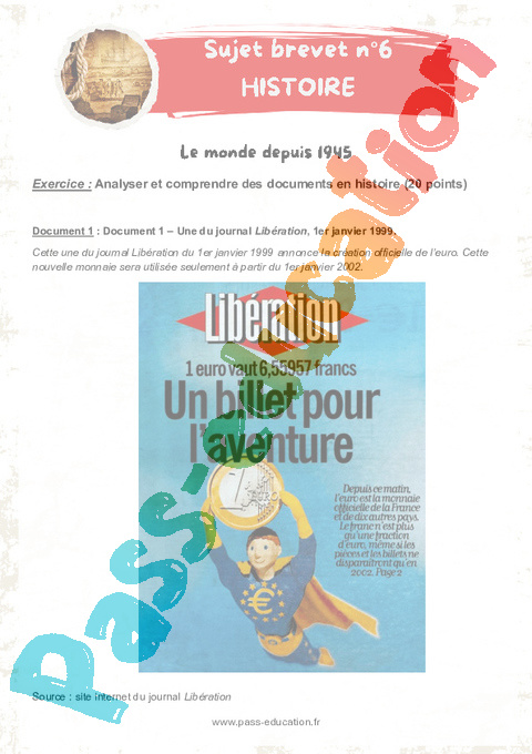 Sujets et corrigés du Brevet Histoire, niveau 3ème sur : Le monde depuis 1945.