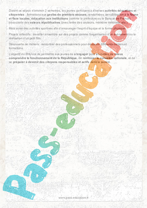L’objectif du SNU est de permettre aux jeunes de s’engager pour les autres, de mieux comprendre le fonctionnement de la République, de renforcer la cohésion nationale, et de se préparer à devenir des citoyens responsables et actifs dans la société.