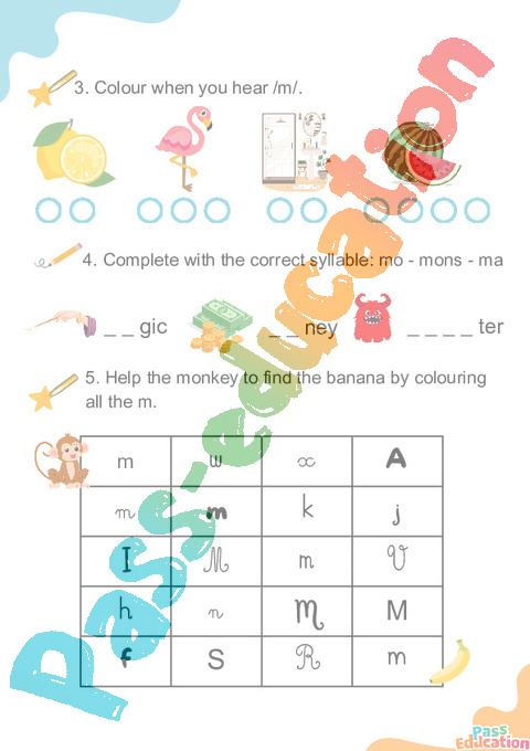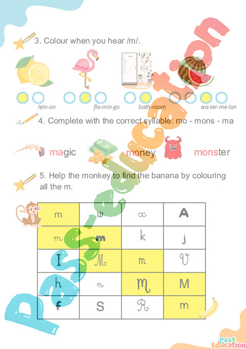 5. Help the monkey to find the banana by colouring all the m.