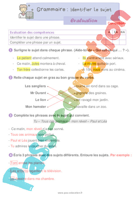 Évaluation avec les corrections pour le ce1 sur identifier le sujet.