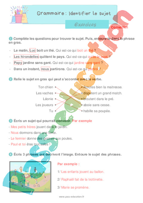 Exercices avec les corrections pour le ce1 sur identifier le sujet.