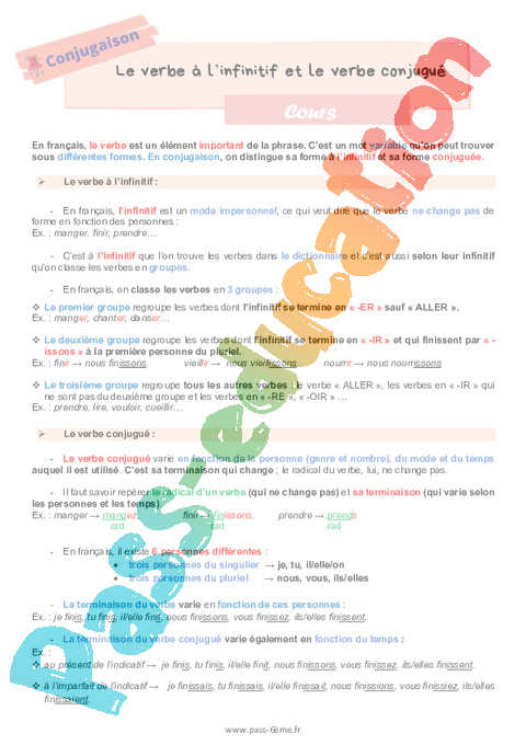 Cours de conjugaison pour la 6ème sur le verbe à l’infinitif et le verbe conjugué.