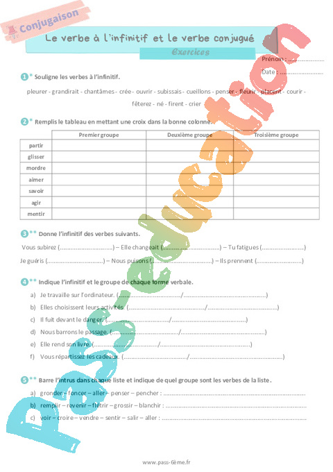 Exercices Le verbe à l’infinitif et le verbe conjugué 6ème pdf