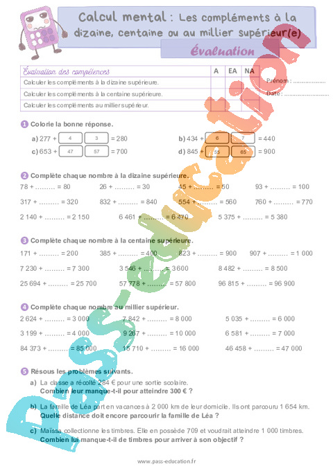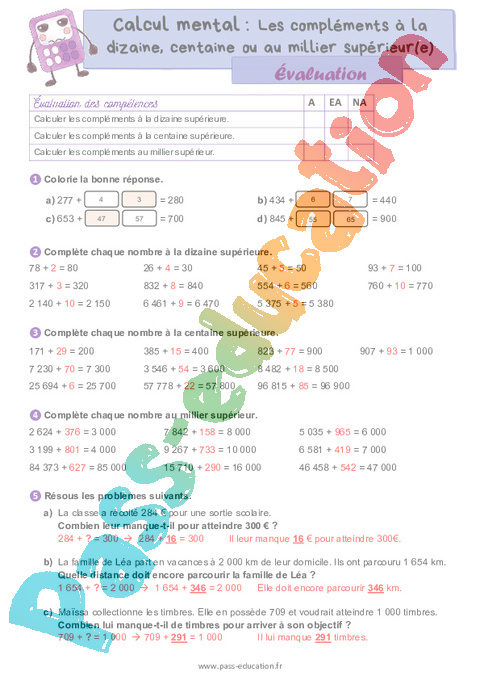 Correction Evaluation Les compléments à la dizaine, centaine ou au millier supérieur(e) – CM1 pdf