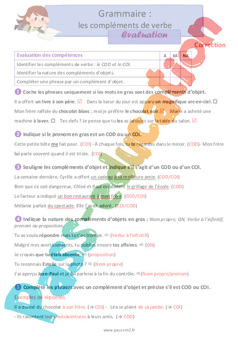 Correction Evaluation Les compléments de verbe (COD, le COI) CM2 pdf