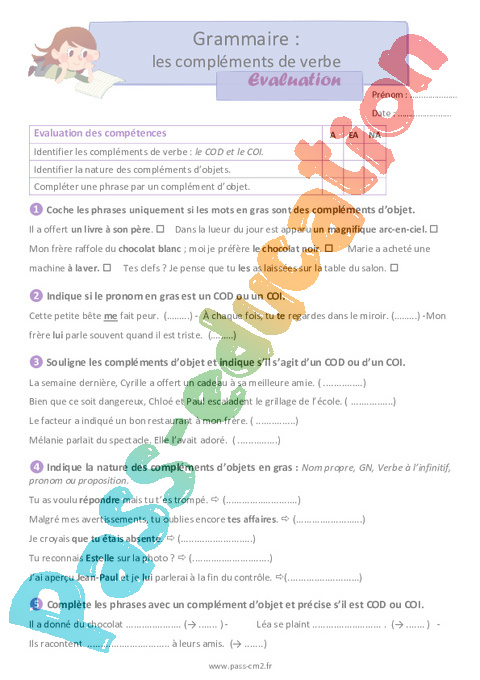 Évaluation de grammaire avec la correction sur les compléments de verbe (COD, le COI) – cm2.