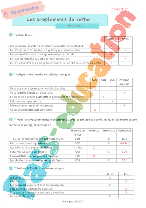 Correction Les compléments de verbe – Exercices de grammaire pour la 6ème pdf