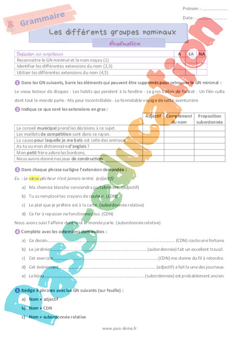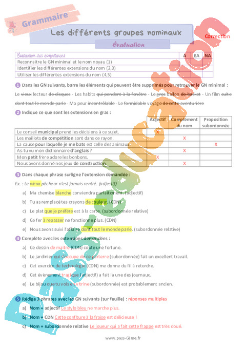 Correction Evaluation Les différents groupes nominaux 6ème pdf