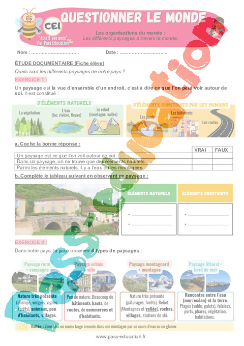 Exercices – Les différents paysages à travers le monde – CE1 – Séquence + vidéo – Apis & ses amis.