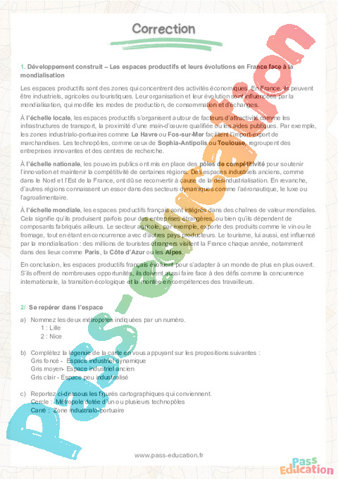 Sous la forme d’un développement construit d’une vingtaine de lignes, vous décrirez et expliquerez, à différentes échelles, le fonctionnement et les dynamiques d’un espace pro-ductif français étudié en classe face à la mondialisation.