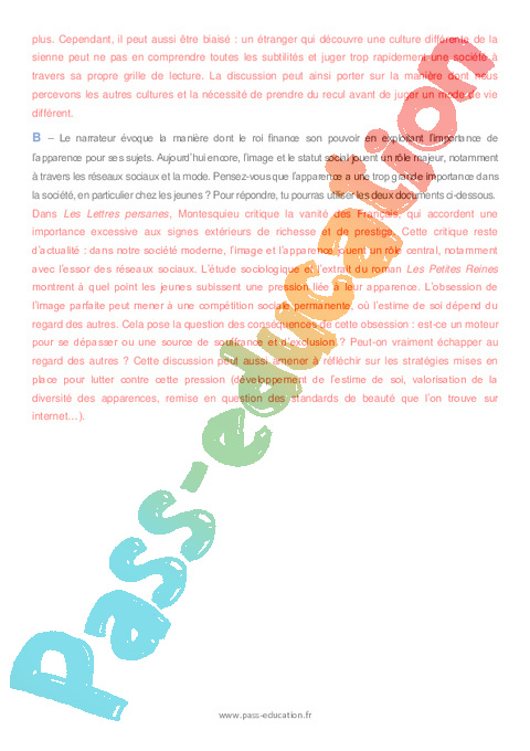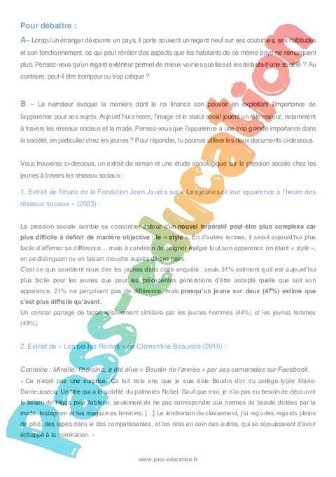 B – Le narrateur évoque la manière dont le roi finance son pouvoir en exploitant l’importance de l’apparence pour ses sujets. Aujourd’hui encore, l’image et le statut social jouent un rôle majeur, notamment à travers les réseaux sociaux et la mode. Pensez-vous que l’apparence a une trop grande importance dans la société, en particulier chez les jeunes ? Pour répondre, tu pourras utiliser les deux documents ci-dessous.