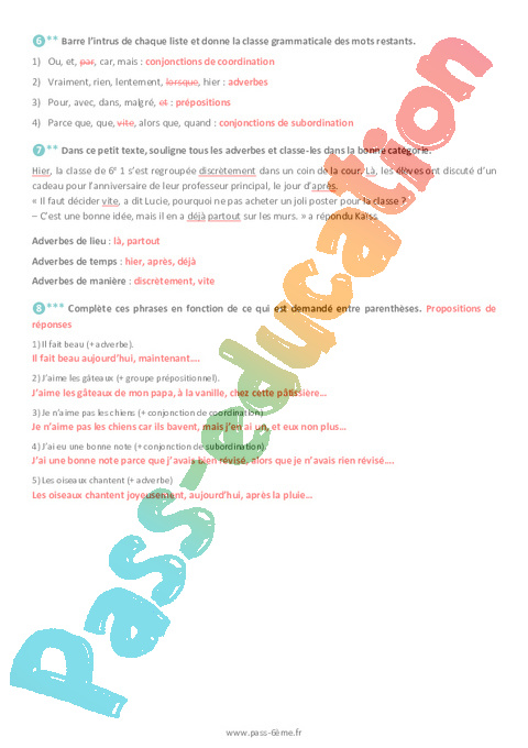 Exercices de grammaire avec la correction sur les mots invariables en 6ème.