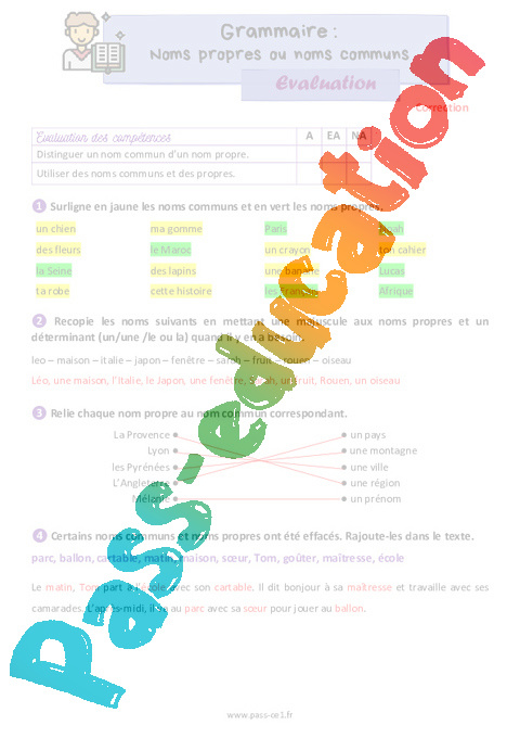 Correction Evaluation Les noms communs et noms propres – CE1 pdf