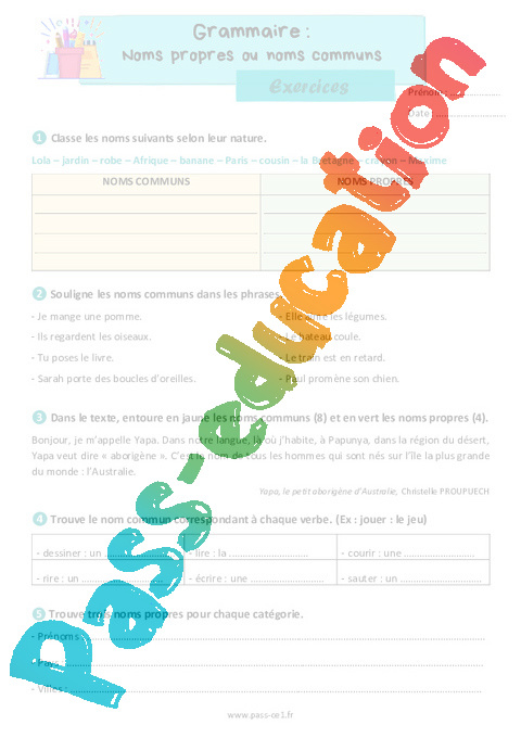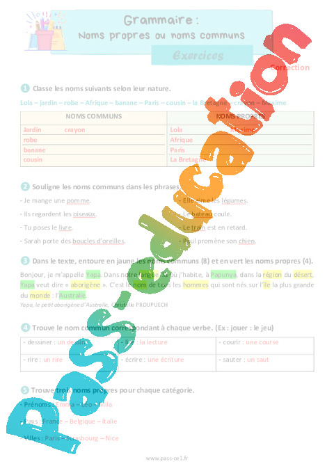Correction Exercices Les noms communs et noms propres – CE1 pdf