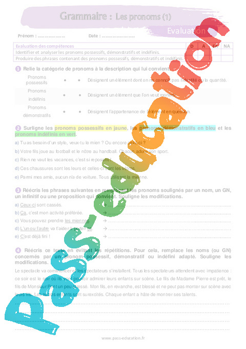 Surligne les pronoms possessifs en bleu, les pronoms démonstratifs en jaune et les pronoms indéfinis en vert.