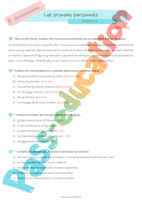 Exercices de grammaire avec la correction sur les pronoms en 6ème.
