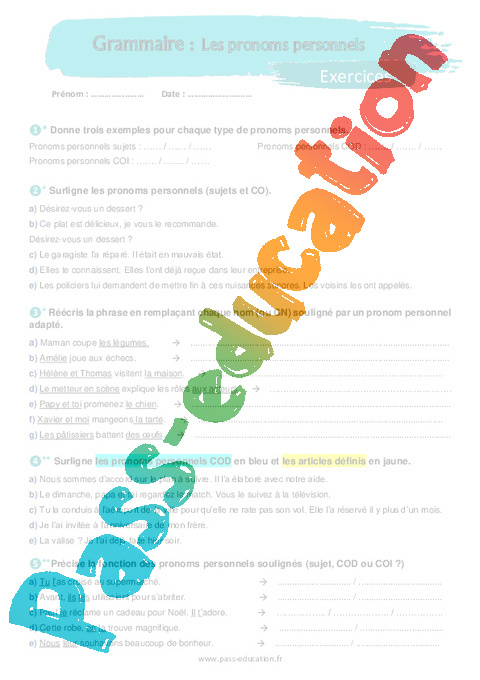 Exercices avec les corrigés sur les pronoms personnels en 5ème.