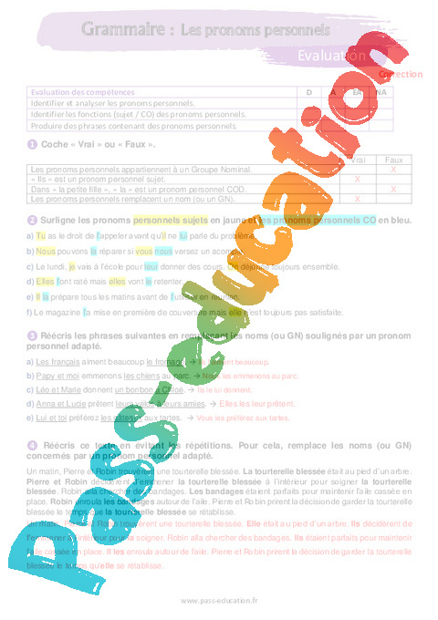 - Evaluation avec la correction sur les pronoms personnels en 5ème.