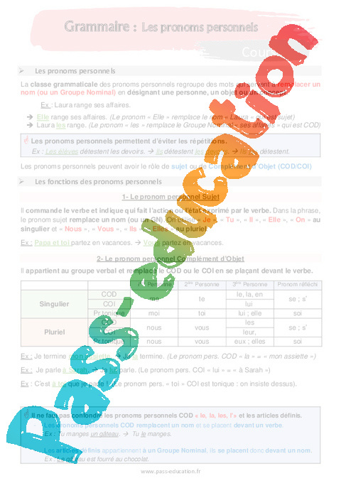 - Cours sur les pronoms personnels en 5ème.
