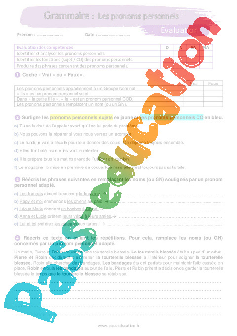 Evaluation Les pronoms personnels – 5ème rtf